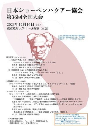 大会プログラム ※大会参加費:無料 開場(10 :00) 開会の辞(10:30)事務局 研究発表(10:30〜12:00) 1.「意志の外部、あるいは他者について――ショーペンハウアー責任論から見えてくるもの」 発表者:藤永 綾乃(同志社大学特任助手) 司会:梅田 孝太(上智大学特任助教) 2.「無目的な「力」は合理的体系と整合し得るか――スピノザの「力能」とショーペンハウアーの「意志」」 発表者:佐藤 洸紀(名古屋大学大学院) 司会:西 章(沖縄大学専任講師) 昼食・休憩(12:00〜12:50) ※評議員会・理事会(合同)12:00〜(終了後、昼食・休憩) 会員総会(12:50〜13:15) 公開講演(会長就任記念講演)(13:25〜14:45) 「ショーペンハウアーに拠って考えてきたこと、考えようとしていること」(仮題) 講演者:多田 光宏(苫小牧工業高等専門学校教授) 司会:齋藤 智志(杏林大学教授) シンポジウム(15:00〜17:40) 「ショーペンハウアーと姉崎正治――姉崎正治生誕150周年記念」 提題者(1):深澤 英隆(一橋大学名誉教授) 「「宗教的人間」・「形而上学的動物」としての姉崎正治――変転する時代のなかで」 提題者(2):堤田 泰成(上智大学中世思想研究所準所員/文学部科研リサーチフェロー) 「ケーベルのショーペンハウアー研究について――姉崎正治とE・v・ハルトマンとの関わりから」 提題者(3):長尾 宗典(筑波大学准教授) 「媒介者としての姉崎正治――『意志と現識としての世界』受容小史」 司会:伊藤 貴雄(創価大学教授) 閉会の辞(17:40) 会長:多田 光宏(苫小牧工業高等専門学校教授) ※コロナウイルス感染症対応のため、懇親会は開催しません。 ※翌日には第40回ニーチェ・セミナーも開催されます(ニーチェ・セミナーに関するお問い合わせは、ニーチェ・セミナー世話人あてにお送りください)。 |